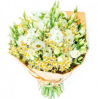 Красивый букет из эустомы и ромашки, в красивой и стильной упаковке.